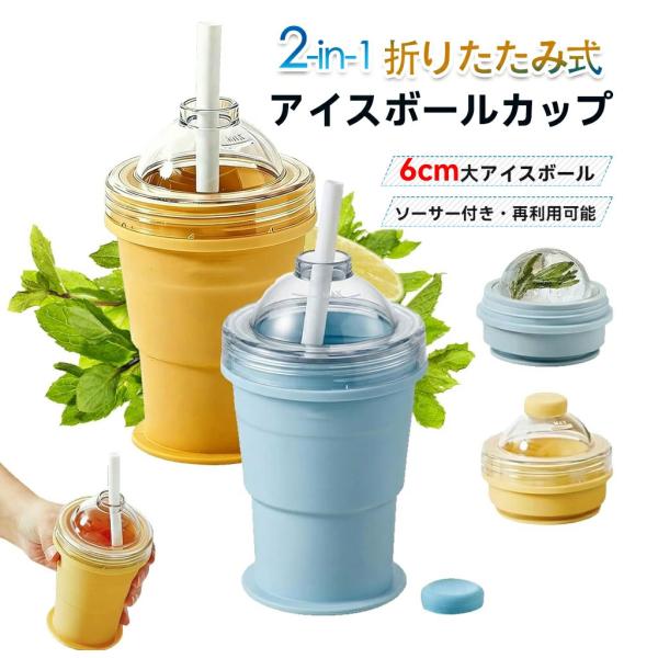 2-in-1 折りたたみ式 アイスボールカップ コンパクト 製氷カップ 吸管付き 食品グレードシリコン製 氷作り器 6cm 飲み物カップ アウトドア 家庭用 簡単脱模
