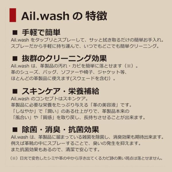 Ail.wash は、革製品に溜まっている雑菌を除菌し、消臭効果も期待出来ます。