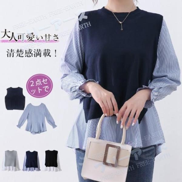 シャツセット 重ね着 ブラウス ニットベスト ベスト セット フリルブラウス ストライプ ノースリーブ