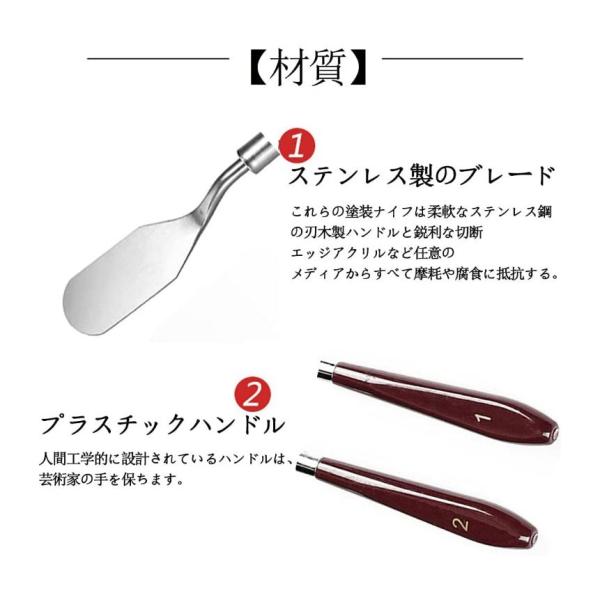 セット内容は形状・サイズの異なるパレットナイフ5本です。ブレードは耐久性のあるステンレス鋼、ハンドルはプラスチック製です。刃と柄の間の曲げ加工により操作性が高く、絵の具の塗布や削り取り、粘土の成形、クリームケーキのデコレーションなどに使用できます。