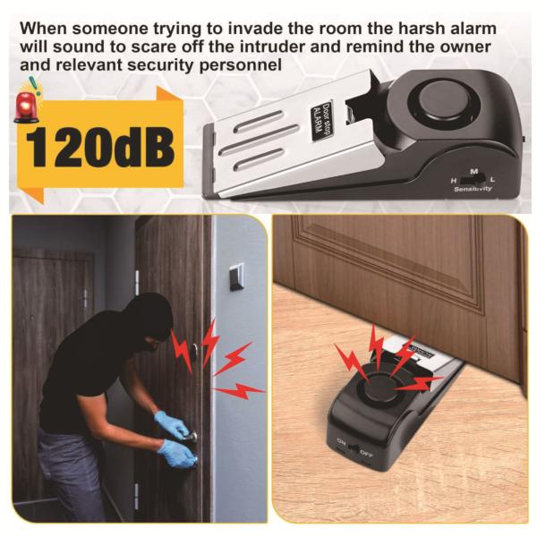 ドアが開くと最大120dBの警報音を鳴らします。感度は低・中・高の3段階から調整可能です。付属の9V電池で作動し、スイッチを入れてドアの下に設置するだけで使用できます。電源をオフにすると、ドアストッパーとしても機能します。
