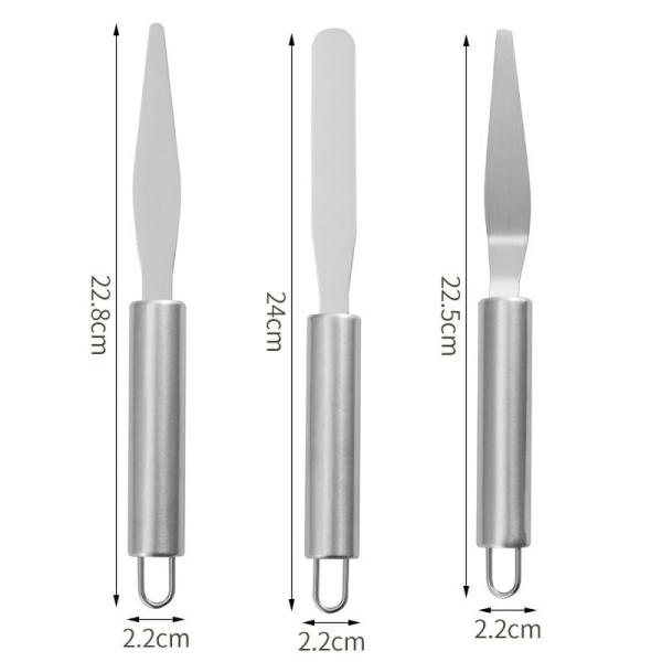 ストレート、角度付き、三角形の3種類の形状が付属します。ステンレススチール製で、手洗いや食器洗い機に対応しています。デコレーションのほか、スプレッドジャムやクリームの混ぜ合わせにも使用できます。