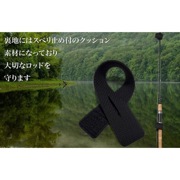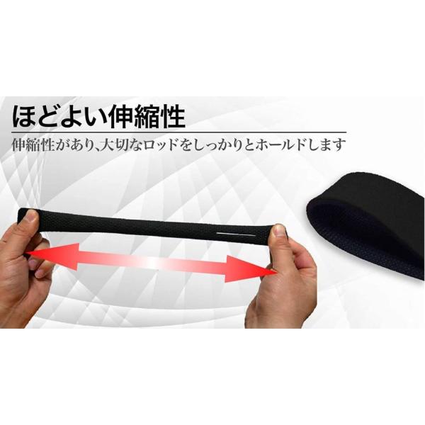 スリット付きでガイドを通して簡単に装着できます。滑り止め加工により、ガイドがないロッドも安定して固定可能です。程よい伸縮性で、必要な長さに調節が自由自在です。高品質ネオプレンと特殊ゴム素材で耐久性に優れています。