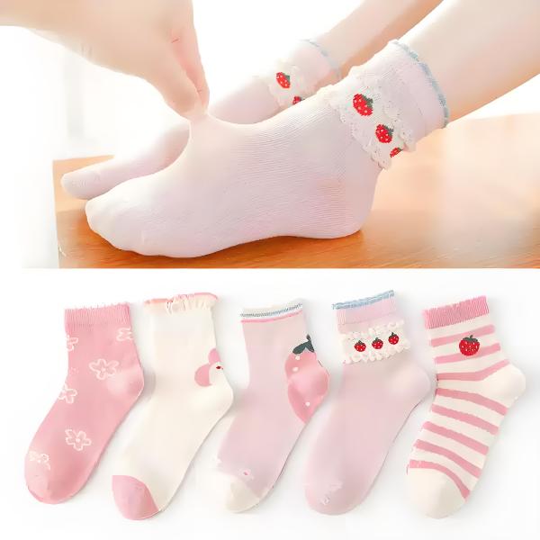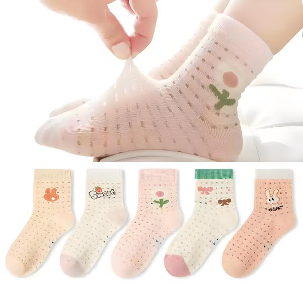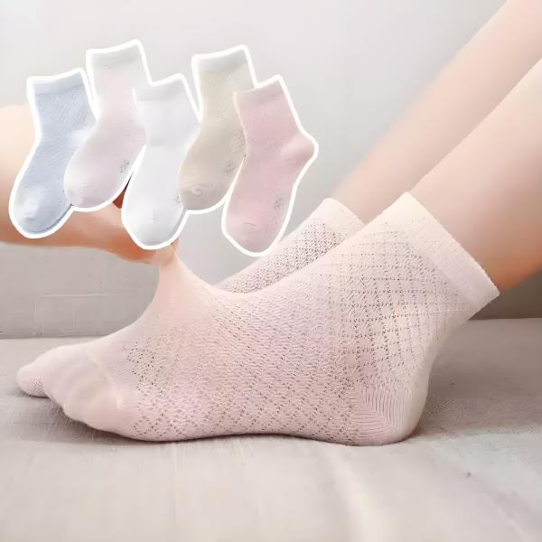 通気性に優れたメッシュ構造の女の子用ソックス5足セットです。綿をベースにした肌触りの良い素材で作られています。
