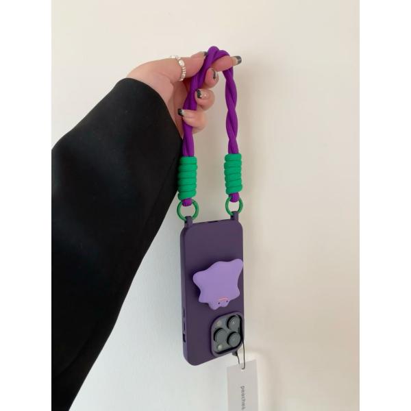 暗紫色の怪獣をモチーフにした液体シリコン製のスマホケースです。ストラップが付属し、斜めがけや首かけが可能です。