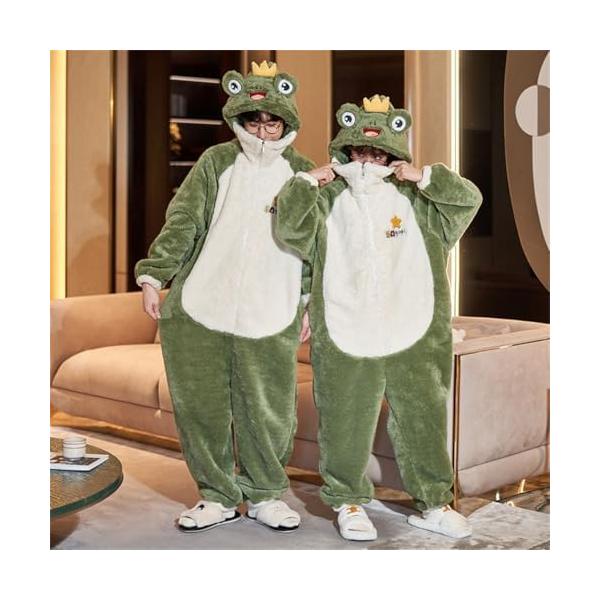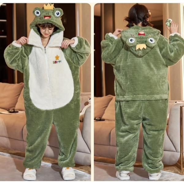 ふわふわもこもこの素材を使用した、フード付きの動物着ぐるみパジャマです。オールインワンデザインで全身を包み込み、防寒性に優れています。