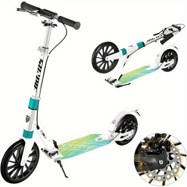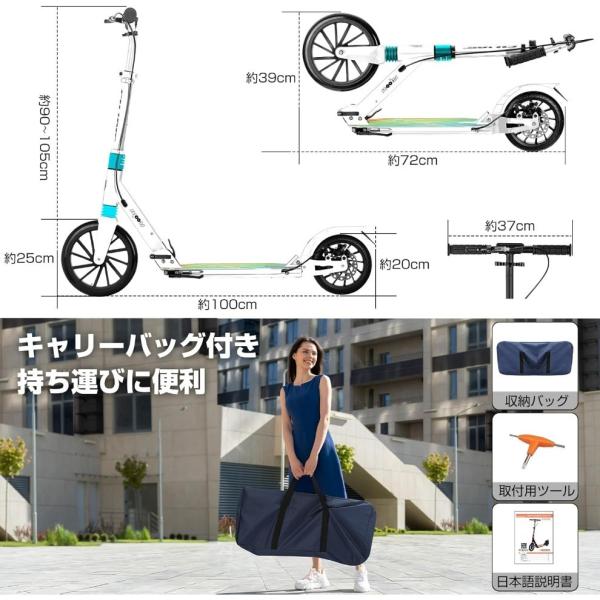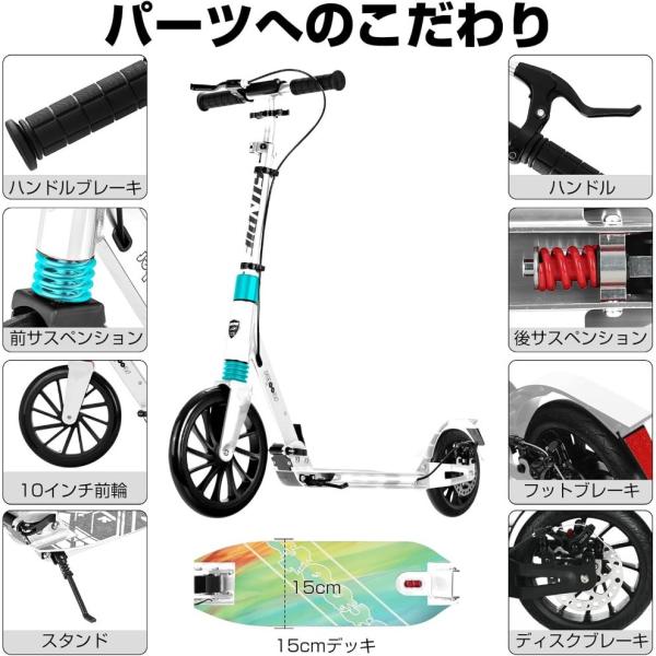 折りたたみ式キックボード アルミ製 大人用 25.4cm全地形タイヤ デュアルサスペンション 4段階高さ調節 手足ブレーキ搭載