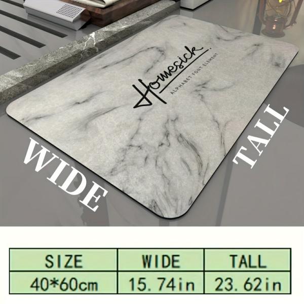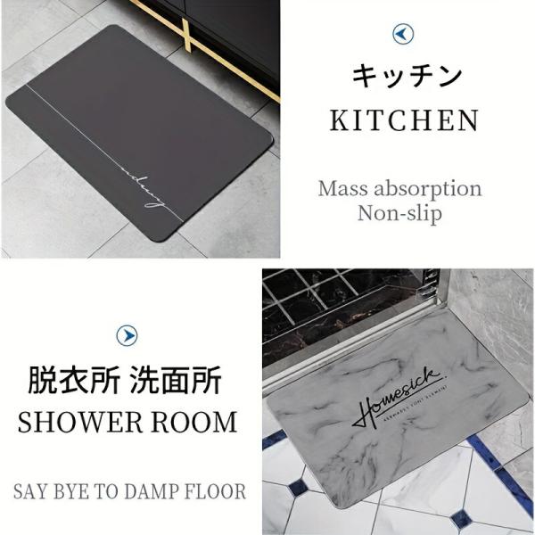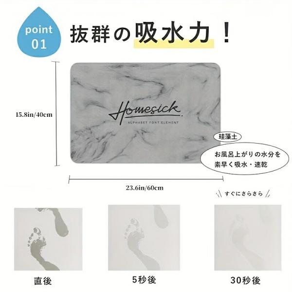 天然珪藻土を使用し、高い吸水性と速乾性があります。表面の凹凸による滑り止め加工が施されています。汚れた場合は水洗い可能で、洗濯の必要はありません。サイズは約幅40cm×奥行60cmです。