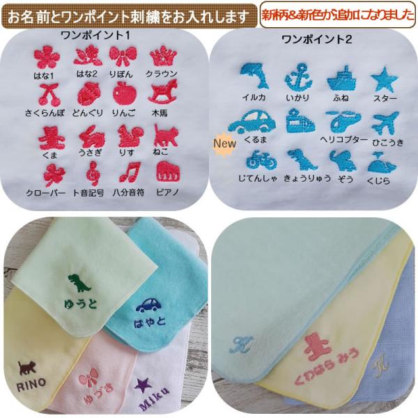 主にお子様に喜ばれる、かわいい柄とお名前を刺繍いたします。