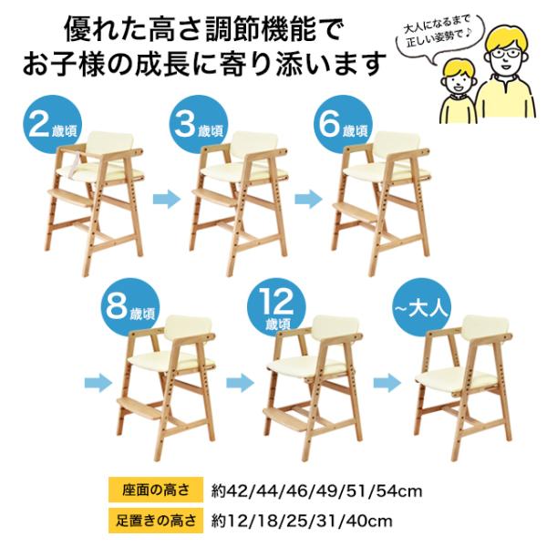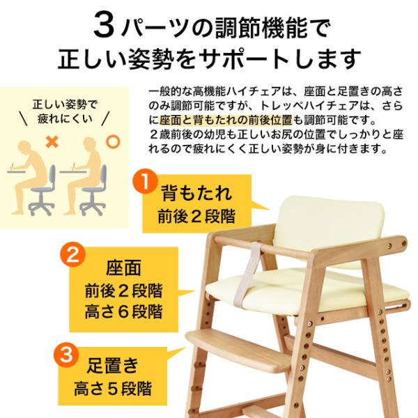 トレッペ ベビーチェア ベルト付 高さ調節 座面6段階 足置き5段階 背もたれ奥行2段階 木製 ハイチェア JUC-3093