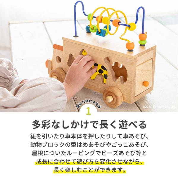 型はめパズルとビーズコースターが一緒に楽しめる、どうぶつさんの「アニマルビーズバス」。引っぱって遊べるプルトーイで、手先を使う遊びがぎゅっと詰まっています。動物ブロックは6種類(ヤギ・キリン・カメ・イヌ・ウシ・ゾウ)。形を見分けてはめたり、ビーズをくるくる動かしたり、遊びながら集中力も育ちます。ビーズコースターは本体に収納でき、ブロックは後ろの扉から取り出せます。