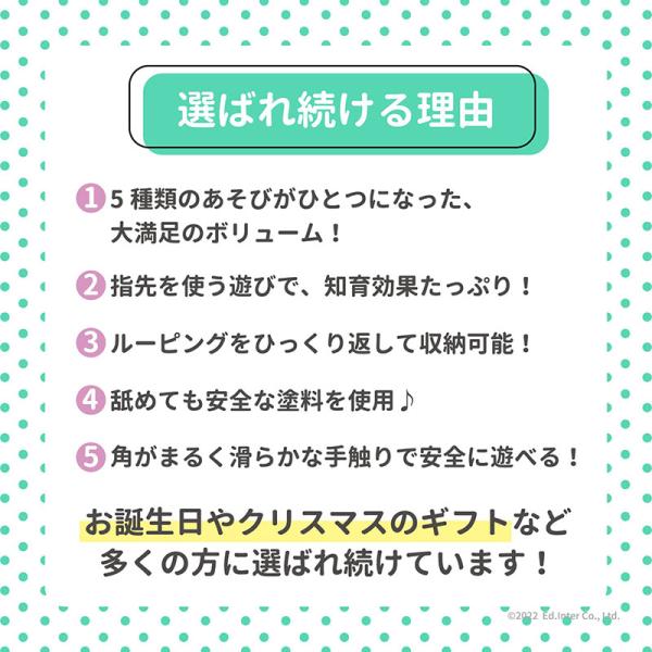 木琴・はめ込みパズル・迷路・数合わせ・ビーズコースターの5つの遊びで、飽きにくく長く楽しめます。