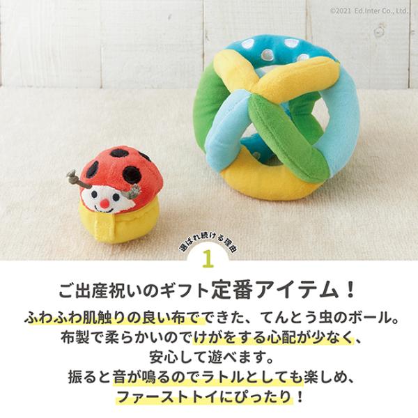 ボールの中に「てんとう虫ラトル」を入れてコロコロ転がすと楽しく遊べます。取り出したてんとう虫はラトルとしてもOK。鏡付きで赤ちゃんの好奇心をくすぐります。