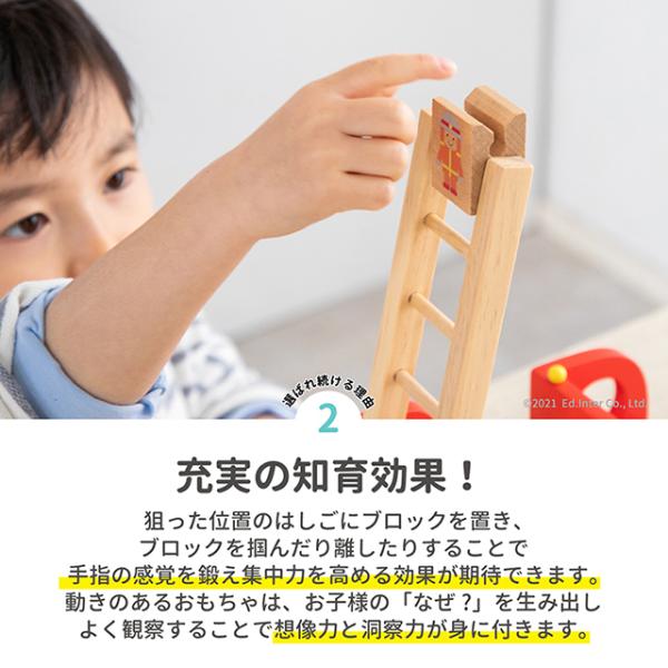はしごを斜めにして隊員を引っ掛けると、カタカタ回転しながら降りていきます。繰り返し遊びで集中力を育て、消防ごっこで想像力も広がります。