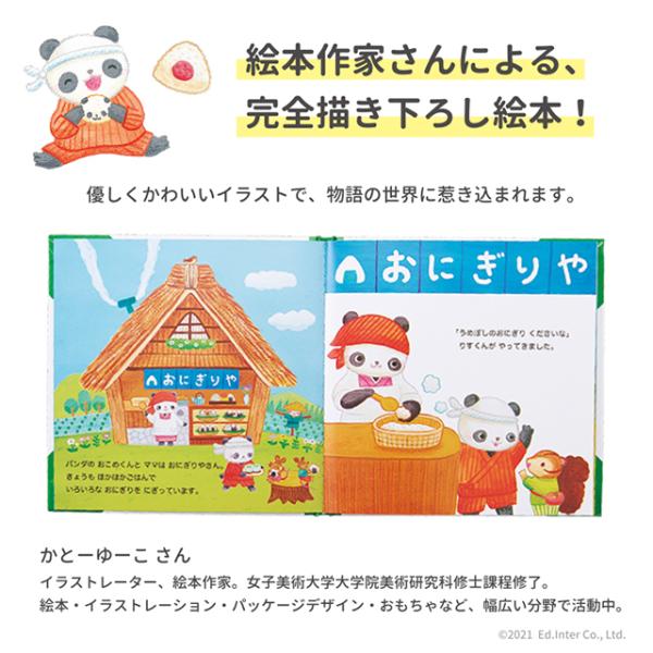 パンダのおこめくんとママといっしょに、おにぎり屋さんごっこが楽しめる“絵本+布おもちゃ”のセットです。