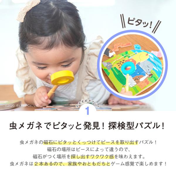 虫メガネでピタッと発見!探検型の動物パズル。