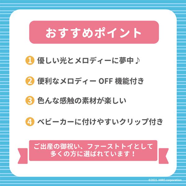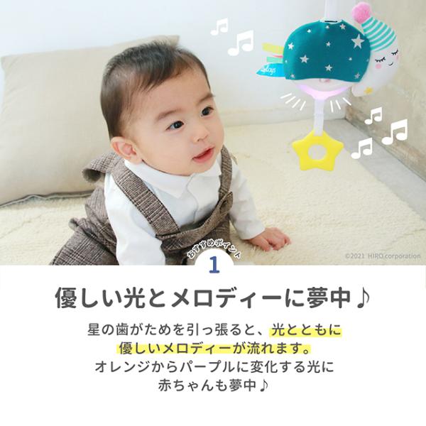 カラフルに変化する光とメロディーで、お出かけにもぴったりなミュージックトイ。歯固めの星を引っ張ると音楽が流れ、ライトがやさしく点灯します。音の種類は全部で4パターンあり連続20分間再生されます。(3種類のメロディー+静かな音・各5分)。再生時に歯固めを引くとメロディーが切り替わります。