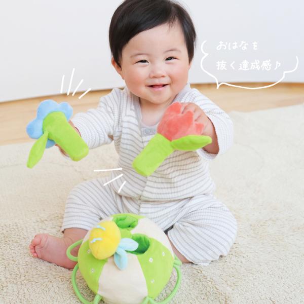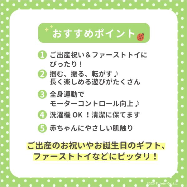 みつばち&お花のラトルと、やわらかいボールで、月齢に合わせて遊び方が変わるのがポイント。洗濯機OK(ソフト洗いコース)で、いつも清潔に使えます。