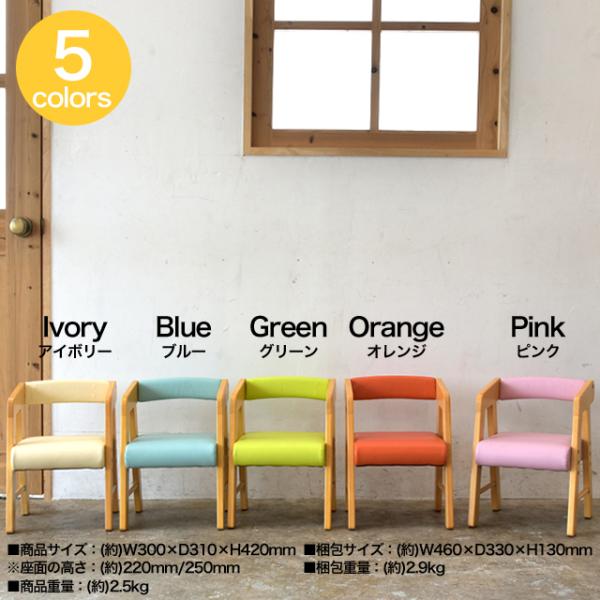 チェアのカラーはアイボリー、ピンク、グリーン、オレンジ、ブルーの5色からお選びいただけます。