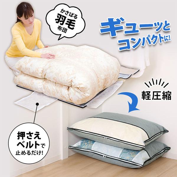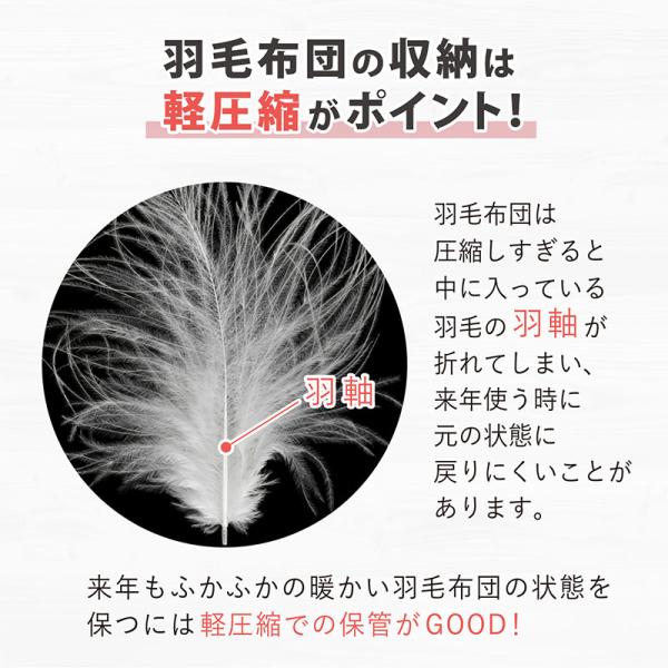 ●押さえベルトで簡単に軽圧縮できコンパクトに。圧縮しすぎないので羽毛を傷めにくく、ふかふか感や暖かさを次のシーズンまでキープ。