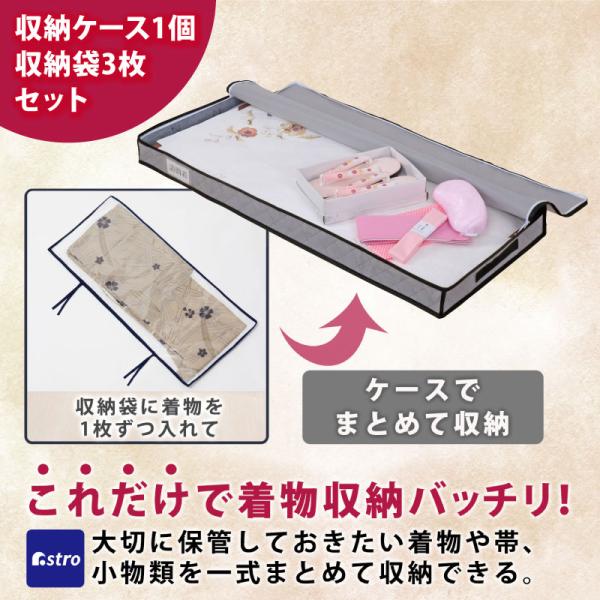 着物収納ケース&保管袋3枚 活性炭消臭 スリム 浴衣 収納袋 通気性の良い不織布製 クリアで中身が見える保存袋 たとう紙 丈夫な生地 アストロ 171-83