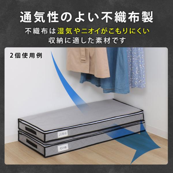 ●収納ケースにはネームホルダーと持ち手付き。スリムなのでクローゼットの上部の棚やベッド下などにも収納しやすい。使わないときは折りたためる。