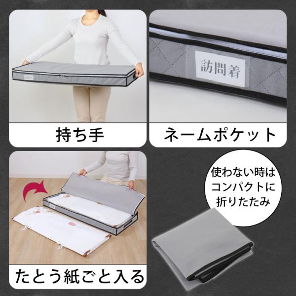 ●保管袋やたとう紙に着物を入れたままケースに収納可能。ダブルジップファスナーで3辺が開くので着物の出し入れがスムーズ。