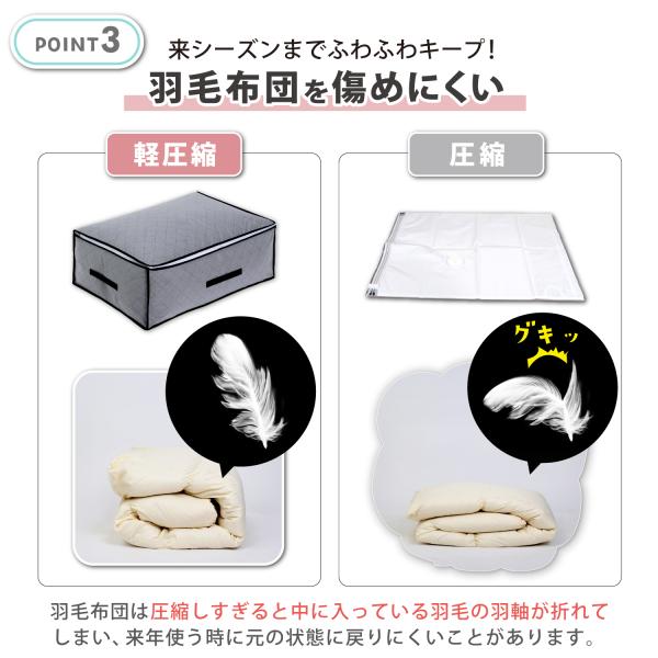 収納目安(1枚あたり):シングルサイズの羽毛布団もしくはダブルサイズの羽毛布団1枚