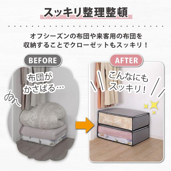 ●活性炭シートでしっかり消臭しながら保管。静電気が発生しやすくホコリが付着しがちな毛布や軽寝具などをにおい・ホコリ・汚れから守る。