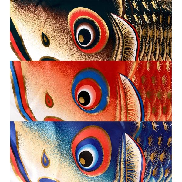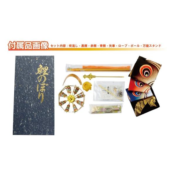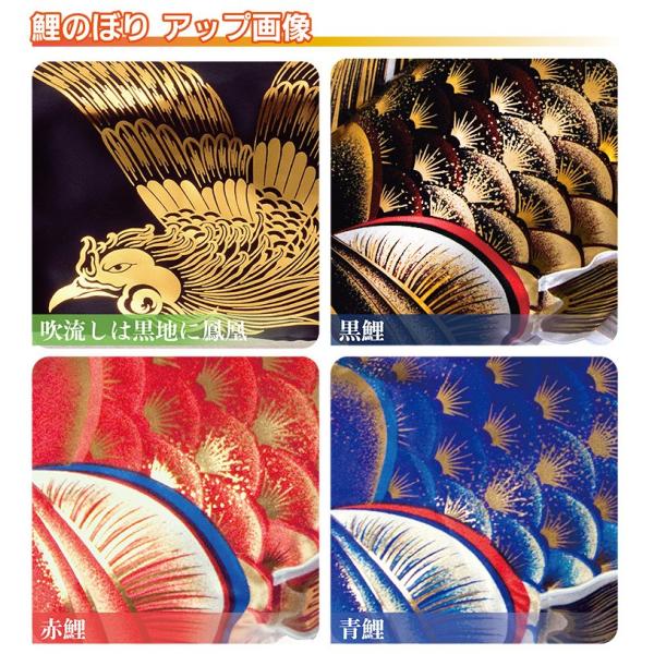 こいのぼり 村上鯉 ベランダ用 鯉のぼり 2026年度新作 こいのぼり 鯉のぼり 村上鯉 黒地に金色で大きな鳳凰が描かれた吹流しが印象的な、コンパクトなサイズのこいのぼり、瑞鳳になります。金色のポールと鯉のぼりの鱗に散りばめたアルミ金箔が、太陽の光でキラキラと輝きます。キラキラと光りながら空を泳ぐこいのぼりは高級感があり、圧倒的な存在感です。ポリエステルサテン生地を使用し、撥水加工を施しております。万能スタンドは水袋を重しにしたスタンドが付いています。スタンドを置いてポールを立てるだけですので設置がカンタンです。 吹流し:1.2m 黒鯉:1.2m 赤鯉:1m 青鯉:0.8m 矢車:きらきら矢車 ポール:19号Gold(1.9m) 万能型スタンド