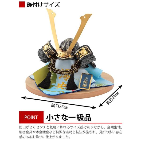 ショッピングモールランキング受賞の五月人形を数多く手がける平安義正が、価格を抑えながらもワンランク上のグレードを目指して、省スペースな兜平飾りを仕立てました。