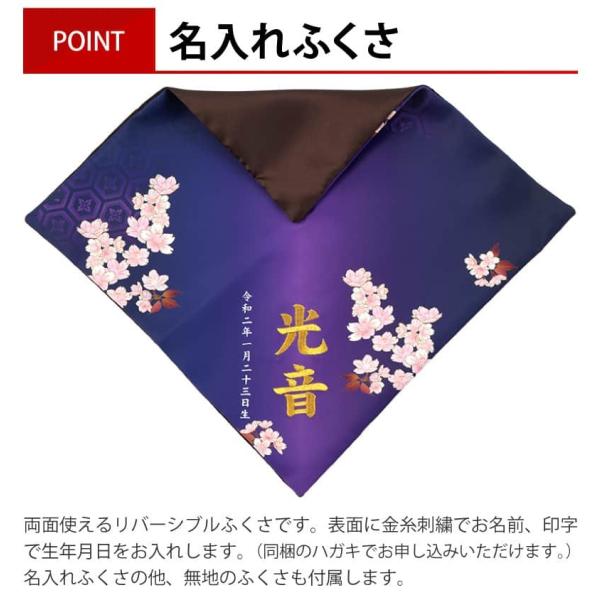 両面使えるリバーシブル仕様で、表面に金糸刺繍でお名前、印字で生年月日をお入れします。