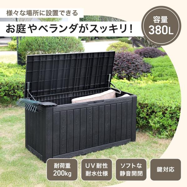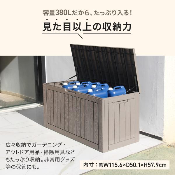 380Lの大容量でガーデニング用品やアウトドアグッズ、防災用品、ポリタンクまでゆったり収まります。
