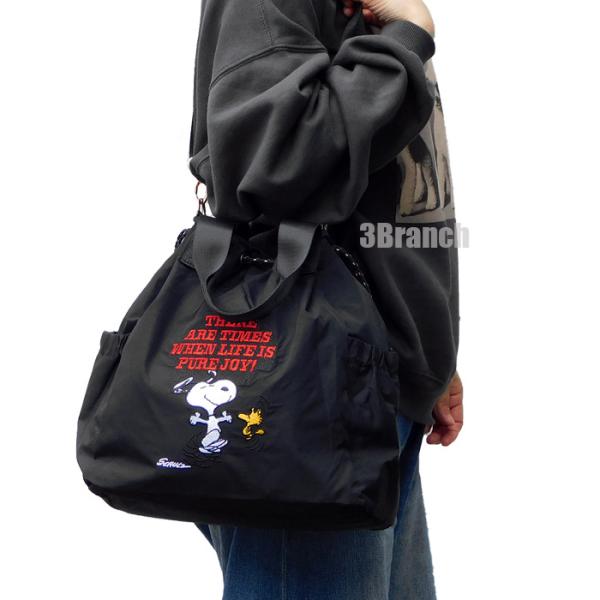 気軽に使えるナイロン素材に前面のスヌーピーのイラストの刺繍がポイント。