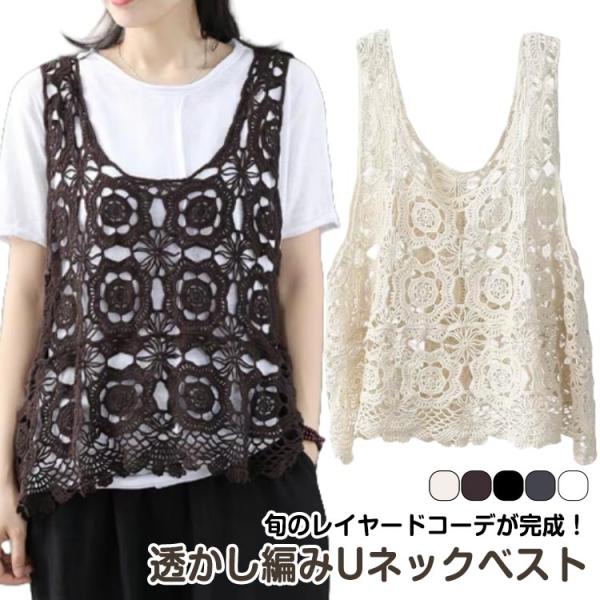 ベスト レディース レイヤード 透かし編み プルオーバー 透かし編み トップス 送料無料 Vネック 夏 かぎ編み カジュアル 無地 サマーニット 重ね