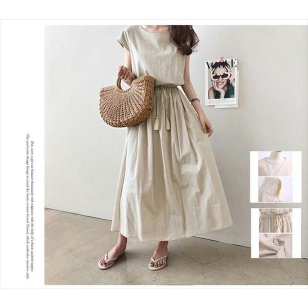 リネン ワンピース フレンチスリーブ ウエストゴム 綿 麻