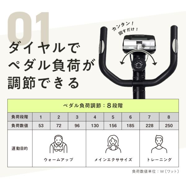商品説明:■全身の筋肉をバランスよく使えるトレーニング機器/■関節への負担が少なく、初心者にもオススメ/■静音性に優れたマグネット負荷方式/■運動負荷調節8段階/■タブレット端末が置けるトレー付き/■体力評価機能つき(6段階評価)/■心拍数測定機能付き(メーターハンドル部)/■足元がたつき防止アジャスター付き/■電源:単3乾電池×2本/■移動用キャスター付属/■メーター表示オートスタート&オフ機能搭載/■お客様組み立て(組立時間目安:大人2人で約60分)
