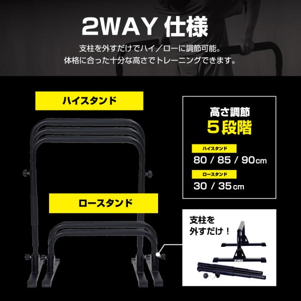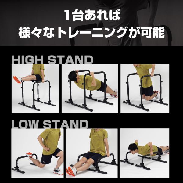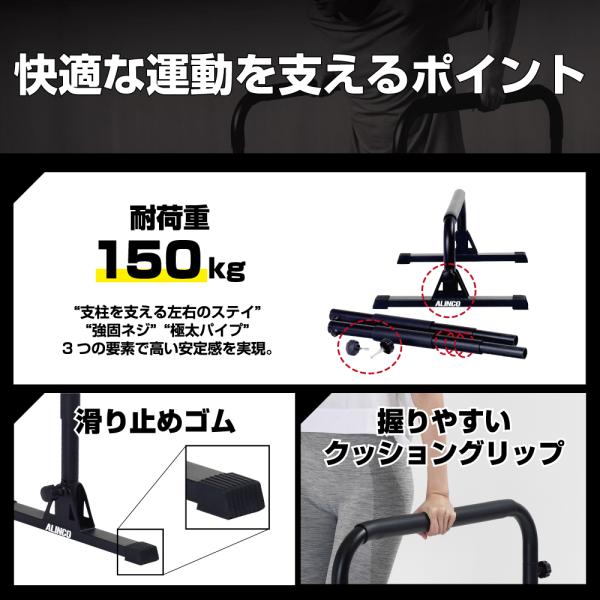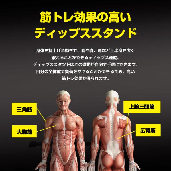 ◎身体を押上げる動きで、腕や胸、肩など上半身を広く鍛えることができるディップス運動が可能