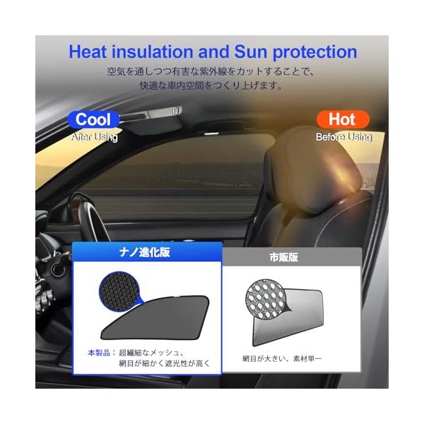 ・超繊細なメッシュ素材ブラックのメッシュ生地は、車内で見ると視線がほぼ影響しません、車外から車内は見えにくく、プライバシー保護にも役立ちます。市販のメッシュサンシェードは網目が大きい、素材単一、遮光性や耐久性が弱い。当店のメッシュサンシェードは細かい網目で嫌な蚊、虫などをきっちんとガードし、断熱効果にも優れ、快適な車内空間を