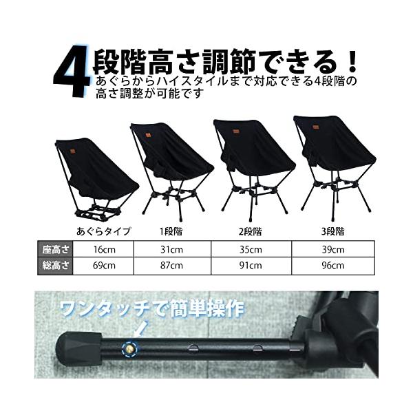 ・4段階高さ調整&3パターン角度調節あぐらタイプから、ハイタイプまで対応できる4段階高さ調整のキャンプチェアです。また、前後脚の高さ調節を通じて、通常の「ゆったりタイプ」から、後ろ脚を伸ばした「まじめにすわるタイプ」、前の脚を伸ばした「よぞら見あげタイプ」がです。