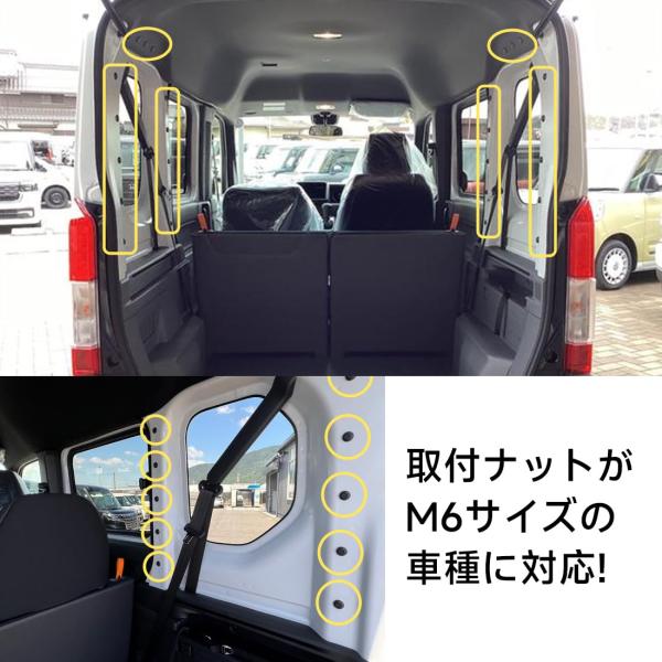 ・適合車種エブリイ、N-VAN、ハイゼットカーゴ、ハスラー、ハイエース、キャラバン、NV350などのユーティリティナットやアシストグリップの取付ナットがM6サイズの車種、M5サイズの車種もボルト変更で取付です。