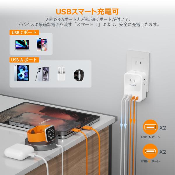 USB-C 電源タップ USB-C付き コンセント タップ TESSAN 3個AC口 2個USB-Aポート 2個Type-Cポート 蛸足コンセン