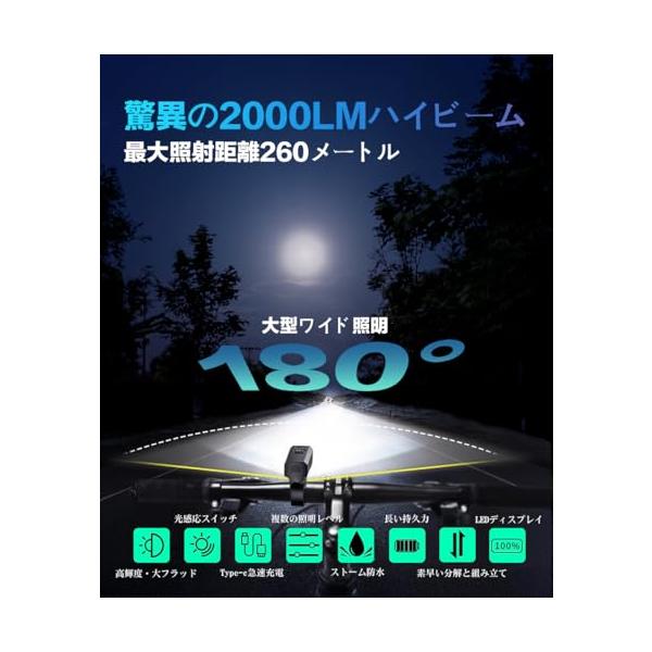 自転車 ライト 超高輝度・遠距離照射 光センサー 自動点灯 自転車ライト 高輝度 2000ルーメン 5つ点灯モード 180°大ワイド照明 IPX