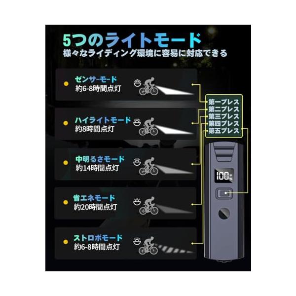 ・高輝度ハイビーム、180°広角照明、5つの照明モード、防眩設計この自転車ライトは、180°広角のアンチグレア設計で、最大2000ルーメンの明るさ、最大照射距離260メートルを誇ります。暗闇でも路面や舗装路面を明瞭に確認でき、安全な走行をサポートします。さらに、オートセンサーモード、高輝度モード、中輝度モード、エコモード、SOSフラッシュモードの5つの点灯モードを備え、様々な照明ニーズに対応します。どんな環境でも安心してご使用いただけます。
