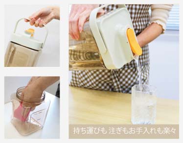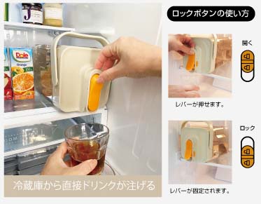 このドリンクサーバーは、冷蔵庫に入れたまま注げる便利な設計が特徴です。