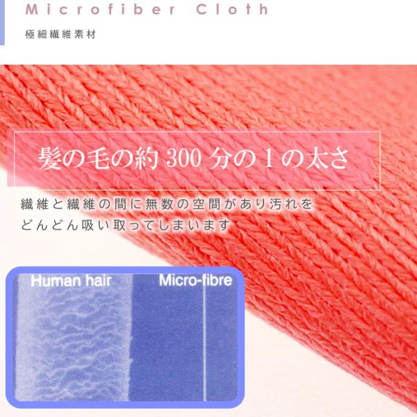髪の毛の約300分の1の太さの極細繊維を使用しているタオルで、繊維と繊維の間に無数の空間があり汚れをどんどん吸い取ってしまいます。