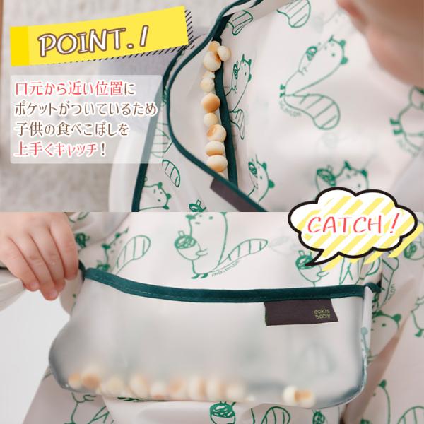 ●ポケットの位置が高いのでテーブルにポケットが触れず食べこぼしをしっかりキャッチ
