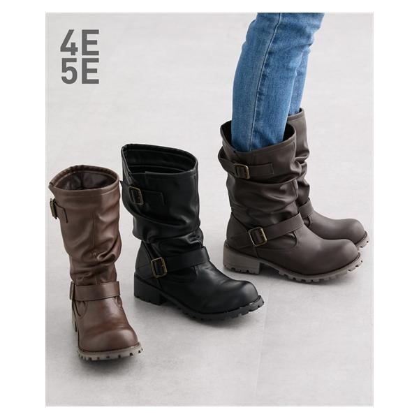 ブーツ 靴 4E 5E 幅広 ゆったり ワイド 大きいサイズ 選べる履き口 レディース くしゅくしゅ エンジニア ルーズ バックル ミドルブーツ (アクアカルダ 送料無料)