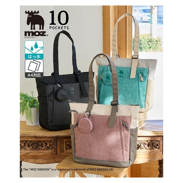 バッグ(鞄) moz モズ ポケット式ポーチ付 11ポケット トート はっ水 多収納 手提げ A4対応 ミニポーチチャーム付 肩掛け 通勤 通学 (アクアカルダ 送料無料)