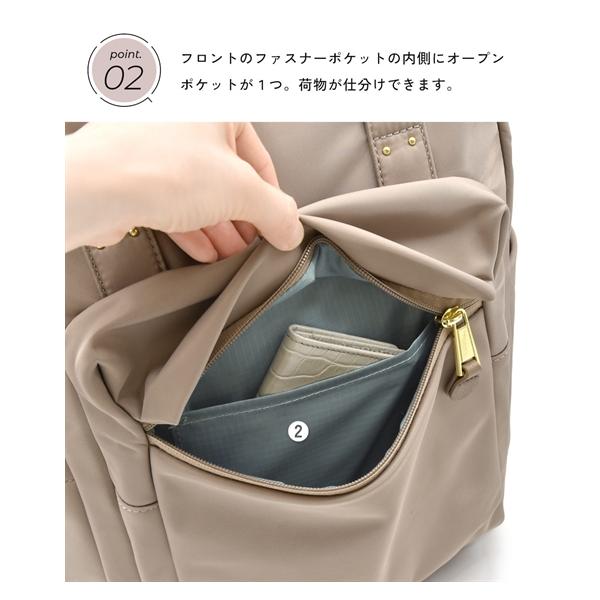 【素材】材質=ポリエステル サイズ=たて約38×よこ(底部)約27×まち幅約13cm 開閉=ファスナー ポケット=中:7個(オープン6、ファスナー1)外:4個(オープン2、ファスナー2) 持ち手の長さ=約20cm取り外し不可 肩ひもの長さ=約43〜66cm調整可・取り外し不可 重量=約590g A4ファイル対応 13インチまでのPC収納 ※生産時期や素材などによって多少個体差があります。